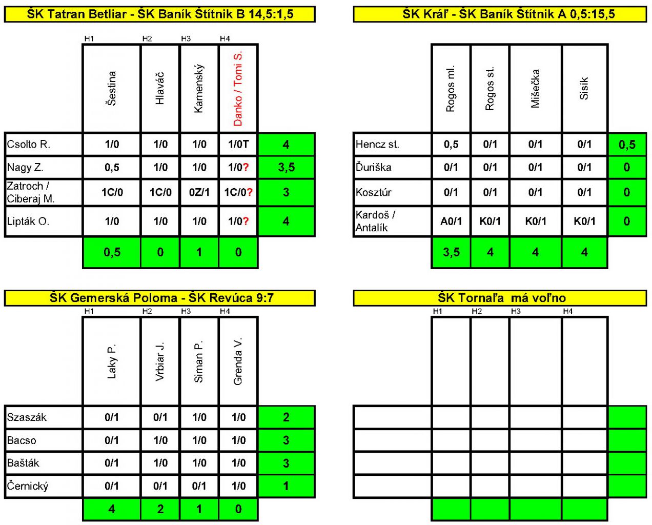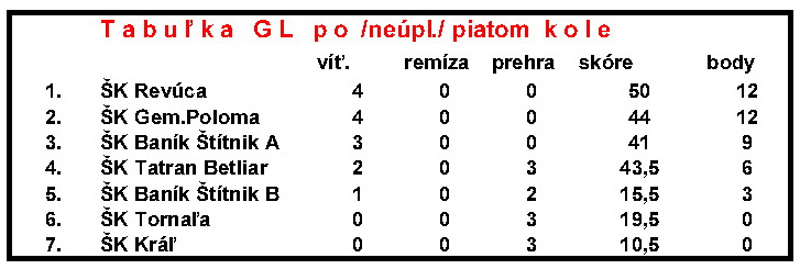 Družstvo Gemerskej Polomy privítalo v 5. kole účastníkov GŠL na domácej pôde v tradičnej zostave: Róbert Szaszák, Ján Bacso, Ondrej Bašták Ďurán a Maxo Černický. V 5.kole Poloma zdolala Revúcu 9:7, Betliar vyhral nad Štítnikom B vysoko 14,5 : 1,5 a Šítnik A nad Kráľom ešte vo vyššom pomere 15,5 : 0,5.
